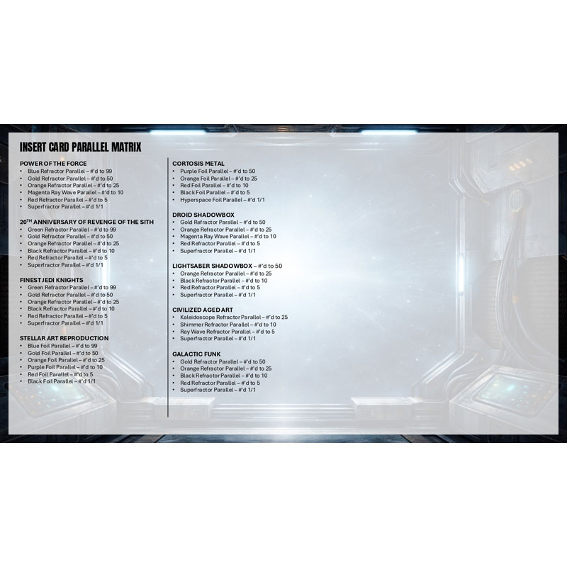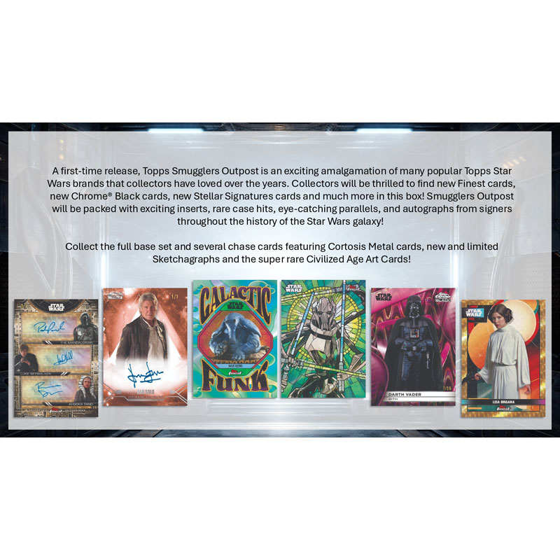 Featuring a mix of base cards, striking inserts, rare parallels, original artwork, and sought-after autographs, Smugglers Outpost celebrates the depth and history of Star Wars storytelling. Each release feels like a hidden cache of galactic treasures, rewarding collectors who are ready to explore beyond the main hyperspace lanes.