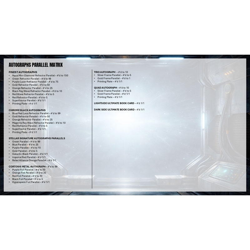 A first-time release, Topps Smugglers Outpost is an exciting amalgamation of many popular Topps Star Wars brands that collectors have loved over the years. Collectors will be thrilled to find new Finest cards, new Chrome® Black cards, new Stellar Signatures cards and much more in this box! Smugglers Outpost will be packed with exciting inserts, rare case hits, eye-catching parallels, and autographs from signers throughout the history of the Star Wars galaxy! Collect the full base set and several chase cards featuring Cortosis Metal cards, new and limited Sketchagraphs and the super rare Civilized Age Art Cards!
