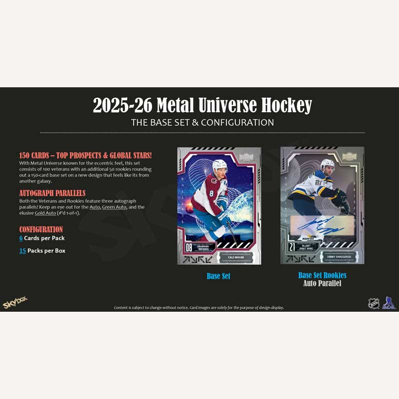 ▪ The 2025-26 Skybox Metal Universe Hockey product sports a 150-card Base Set designed to take collectors to another universe! The Base Set breaks down as follows: Veterans (1-100) and Rookies (101-151).
