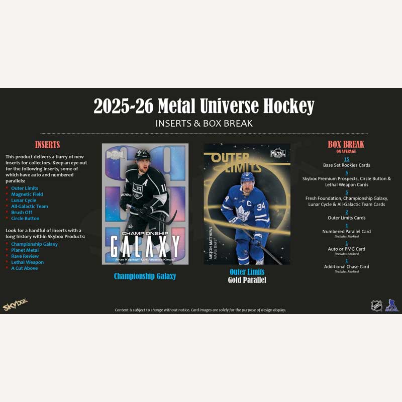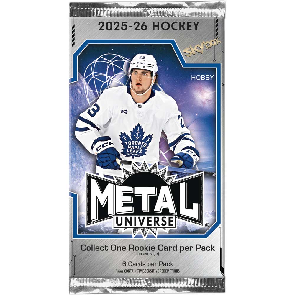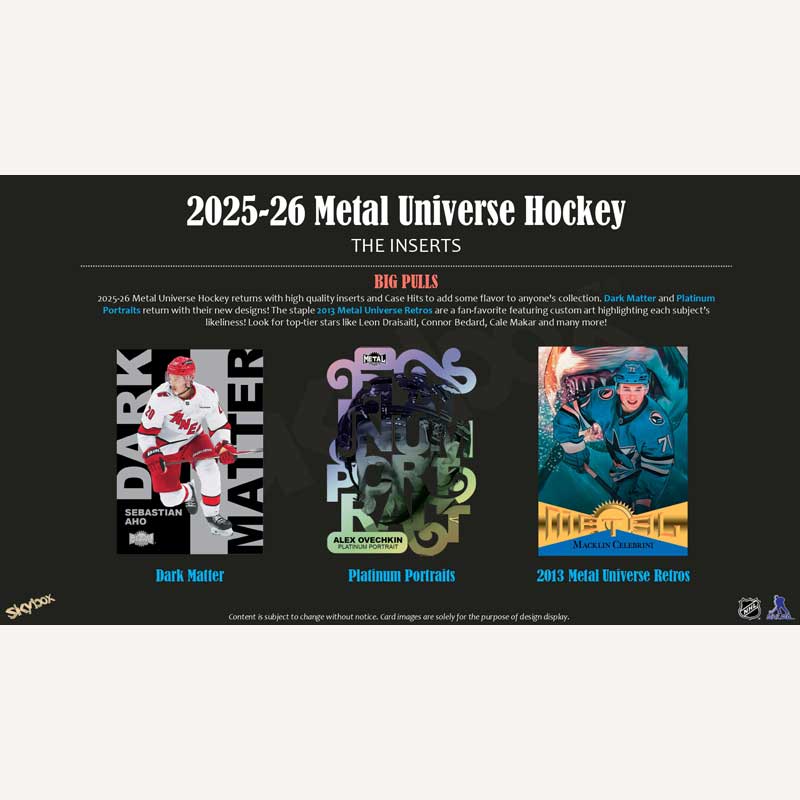 ▪ 2025-26 Metal Universe Hockey returns with high quality inserts and Case Hits to add some flavor to anyone's collection. Dark Matter and Platinum Portraits return with their new designs! Look for this new design of Dark Matter as these stunning cards are slated to deliver one (1) per Case, on average!