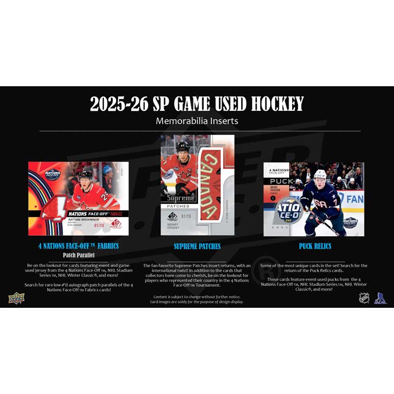 - 4 Nations Face-Off TM Fabrics: This all-new insert set features memorabilia worn during the 4 Nations Face-Off TM . Search for rare low-#’d autograph patch parallels of your favorite international stars!