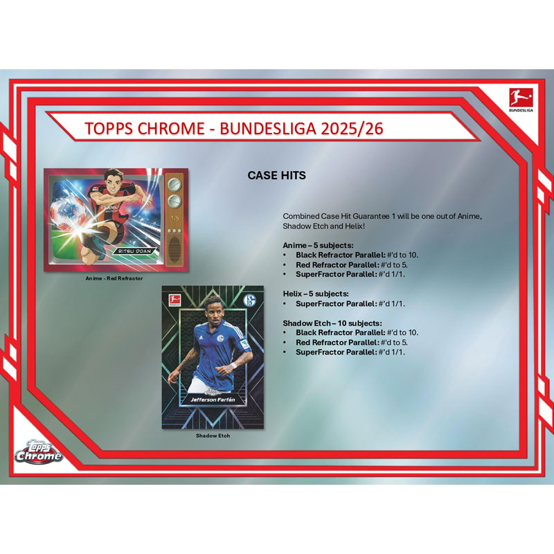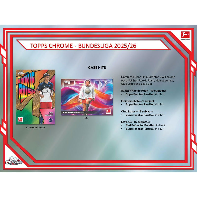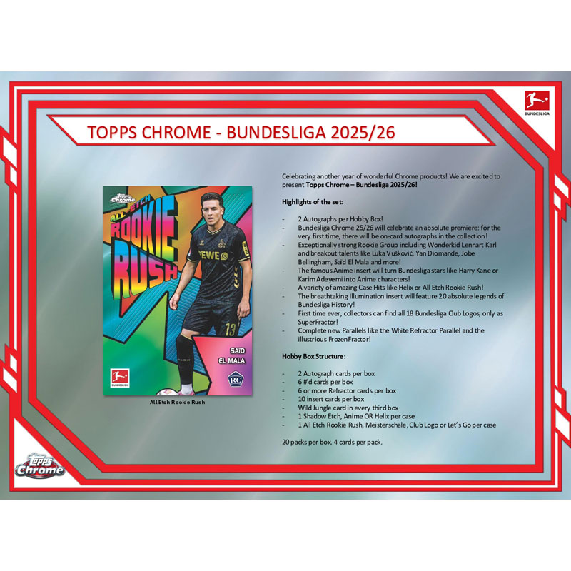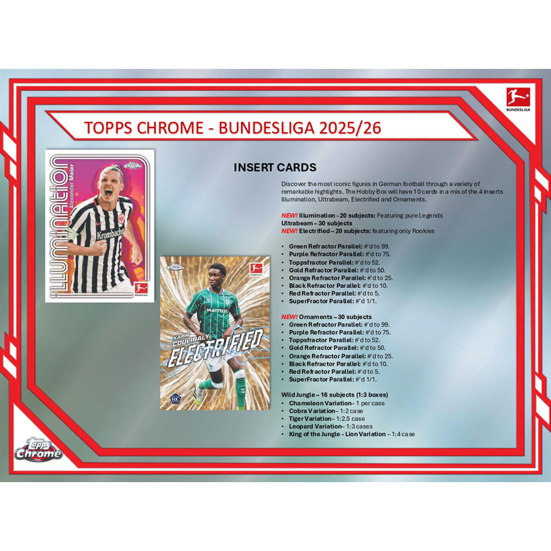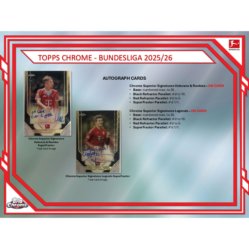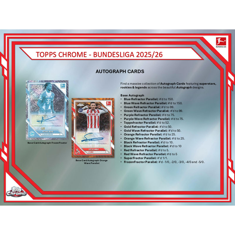 With bold Chrome® imagery, expansive parallel rainbows, and a powerful autograph lineup, Topps Chrome® Bundesliga 2025/26 delivers an unmatched ripping experience worthy of the Bundesliga.