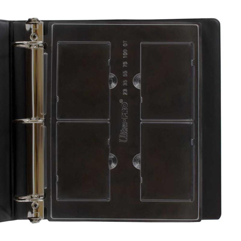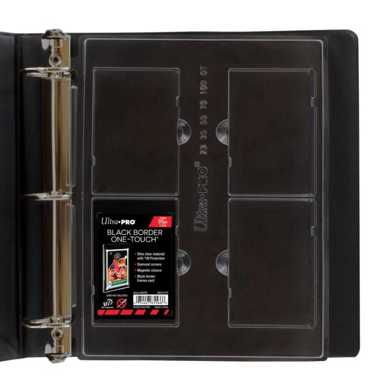 The ONE-TOUCH Display Page is the perfect way to store, organize and easily view your cards in an Ultra PRO 3-ring album. This page can hold cards in 23pt, 35pt, 55pt, 75pt or 100pt ONE-TOUCH displays and is designed to hold 4 ONE-TOUCH displays in a rigid, 3-hole punched page. It features special lock-in tabs and finger notches to easily remove and reorganize slabs. These pages are a great way to show off your collection or easily carry to conventions.