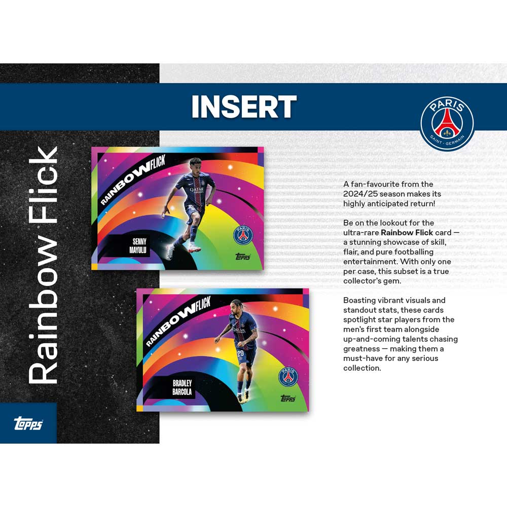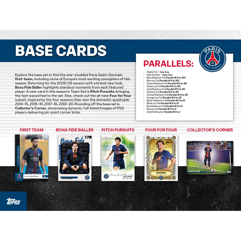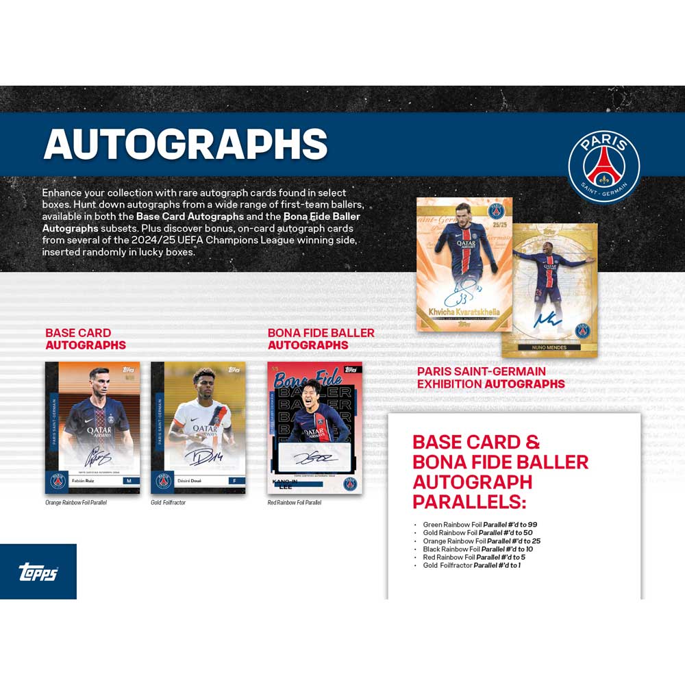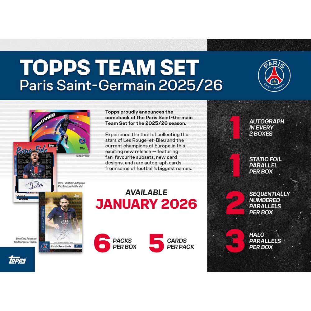 The Topps Paris Saint-Germain Team Set is back for the 2025/26 season, giving you a chance to collect the stars of Les Rouge-et-Bleu and the current champions of Europe!