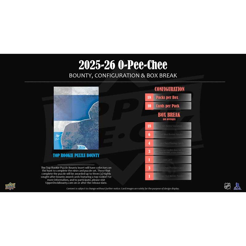 • O-Pee-Chee boasts a comprehensive 600-card base set which includes a 100-card high-series subset featuring only 4 Nations Face-Off Stars and 2025-26 Marquee Rookies. Every pack includes, on average, one (1) high series card!