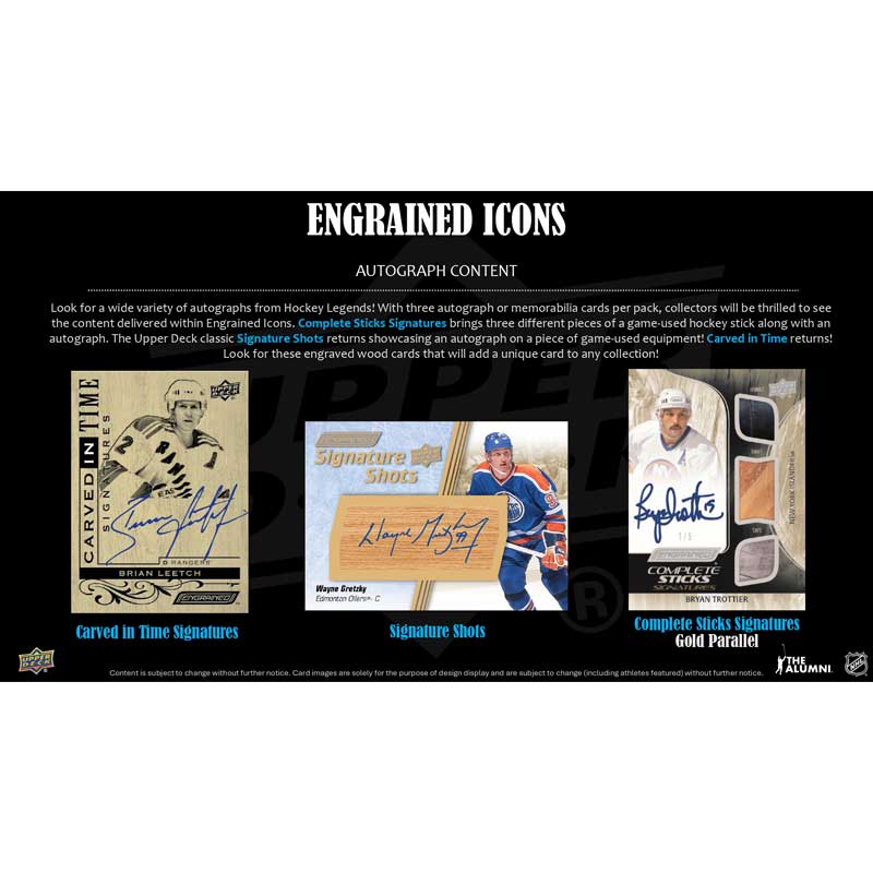 - Look for a wide variety of autographs from Hockey Legends! With three autograph or memorabilia cards per pack, collectors will be thrilled to see the content delivered within Engrained Icons.