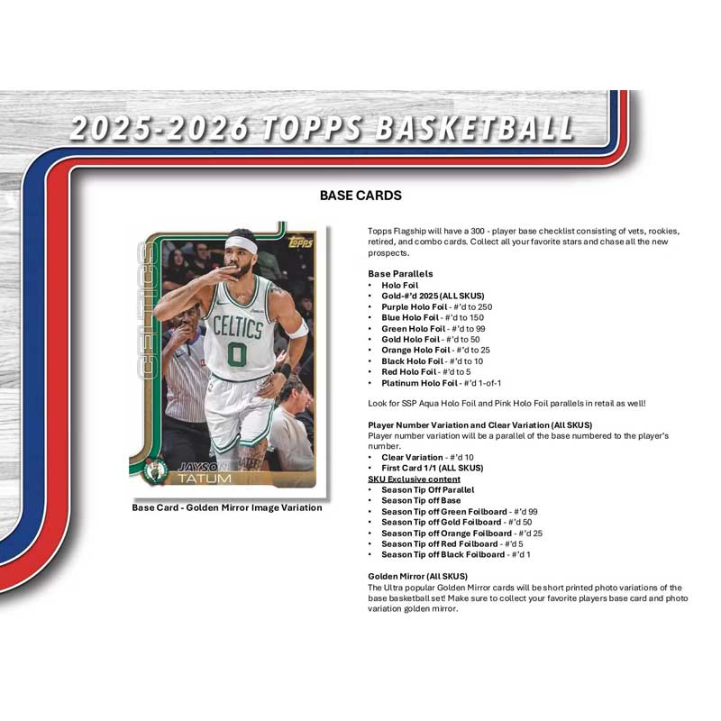 Get ready to rip into a slam - dunk set packed with the hottest Rookies, superstar Vets, and legendary Retired NBA icons. The 2025 Topps Flagship Basketball set delivers fresh, clean designs that capture the pulse - pounding energy of today's game - all while honoring the iconic look and feel of past Flagship releases.