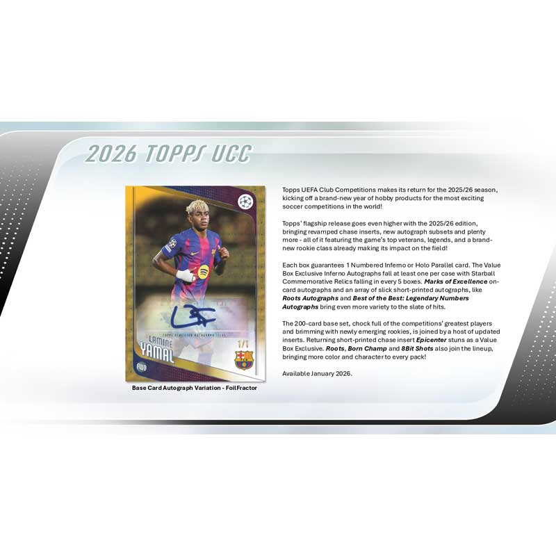 Topps UEFA Club Competitions makes its return for the 2025/26 season, kicking off a brand-new year of hobby products for the most exciting soccer competitions in the world!