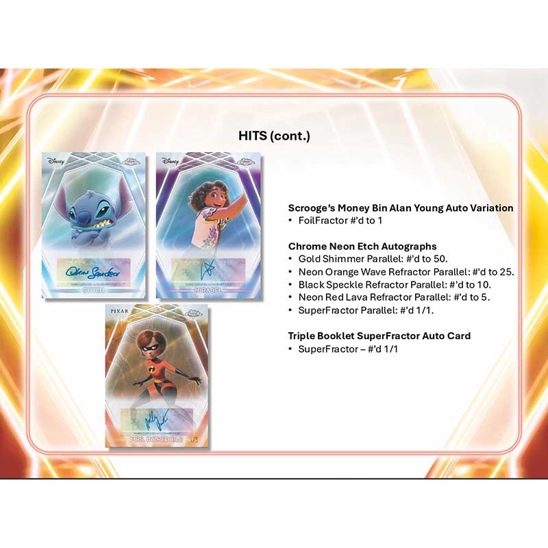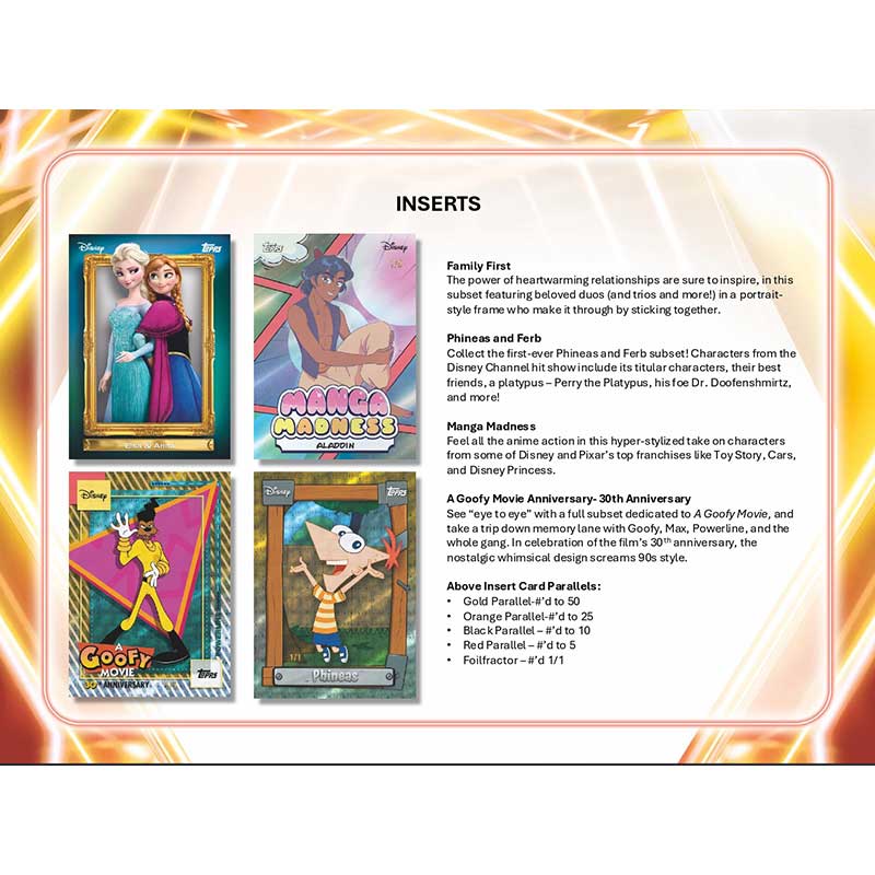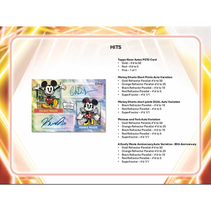 The action-packed, thrilling, and laugh-outloud side of Disney is here to excite with the first-ever Topps cards of characters from Phineas and Ferb, Epic Mickey, Descendants, and Gargoyles! 2026 Topps Disney Neon will feature big chase hits along with autographs, one-of-a-kind sketches, and classic comic cuts!